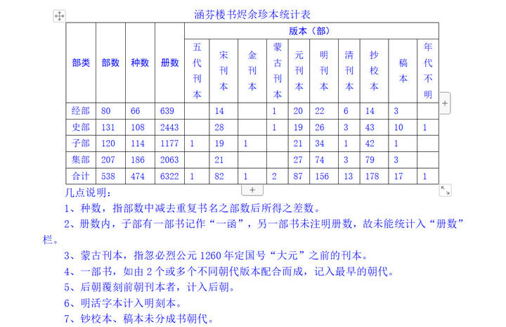 张人凤提供的抗战后涵芬楼残存于世的相关珍本统计图表。