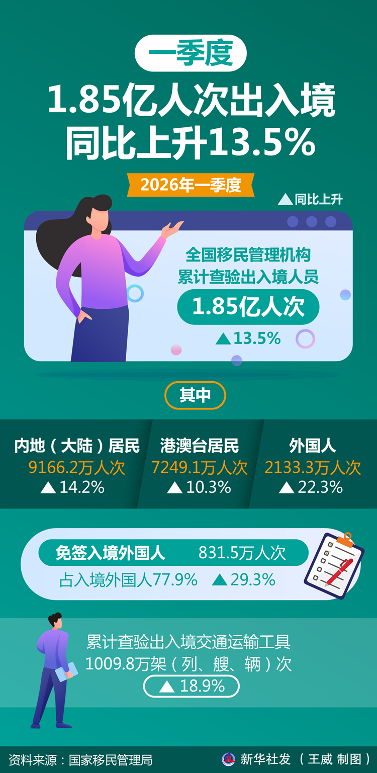 新华社北京4月10日电(记者孙鹏程、刘硕)记者4月10日从国家移民管理局新闻发布会获悉,2026年一季度,全国移民管理机构累计查验出入境人员1.85亿人次,同比上升13.5%;其中内地(大陆)居民9166.2万人次、港澳台居民7249.1万人次、外国人2133.3万人次,同比分别上升14.2%、10.3%、22.3%;免签入境外国人831.5万人次,占入境外国人77.9%,同比上升29.3%。累计查验出入境交通运输工具1009.8万架(列、艘、辆)次,同比上升18.9%。