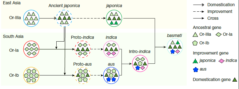 基于高质量的基因组序列,对亚洲栽培稻各类群中的早期关键驯化基因进行单倍型分析,证明所有亚洲栽培稻的驯化位点均来源于粳稻祖先Or-IIIa,进一步证实了亚洲栽培稻单起源假说,为持续数十年的学术争议提供了关键证据。此外,研究还发现在南亚各栽培稻类群之间存在广泛的基因交流,并由此定义了一个新的栽培稻亚群intro-indica,成功绘制了一幅全面的水稻进化和驯化路线图。